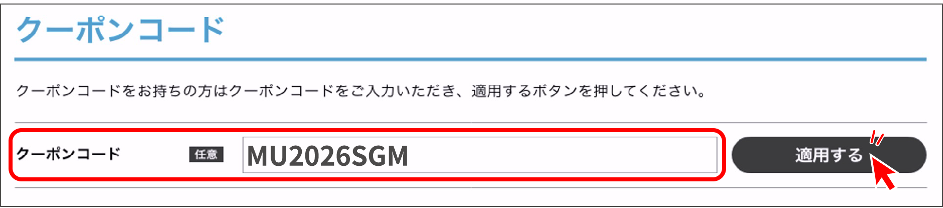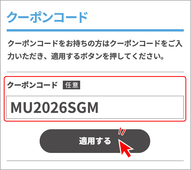 - 3クーポンコード「MU2026SGM」を入力
