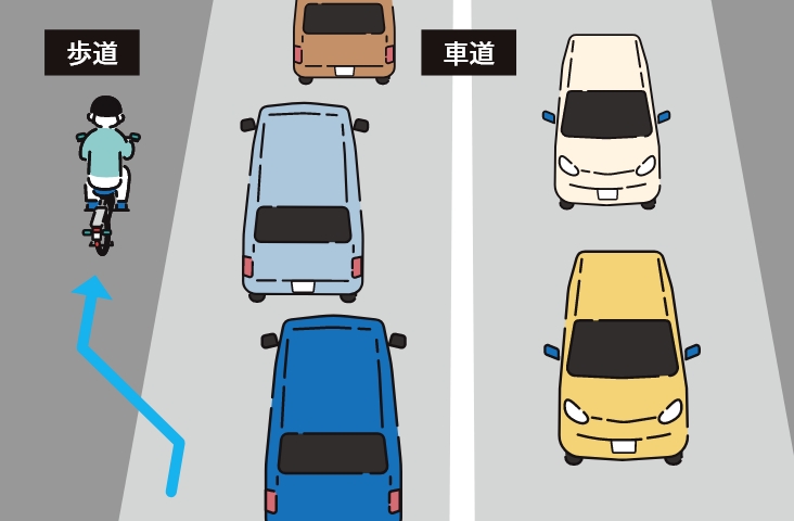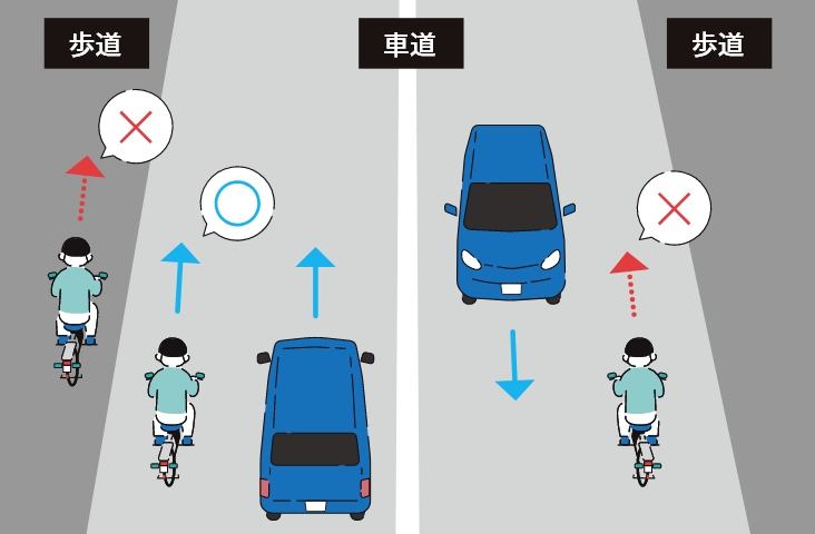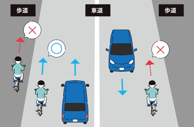 原則、「車道の左側の端」を通行します。歩道通行や車道の右側通行をしてはいけません。