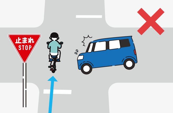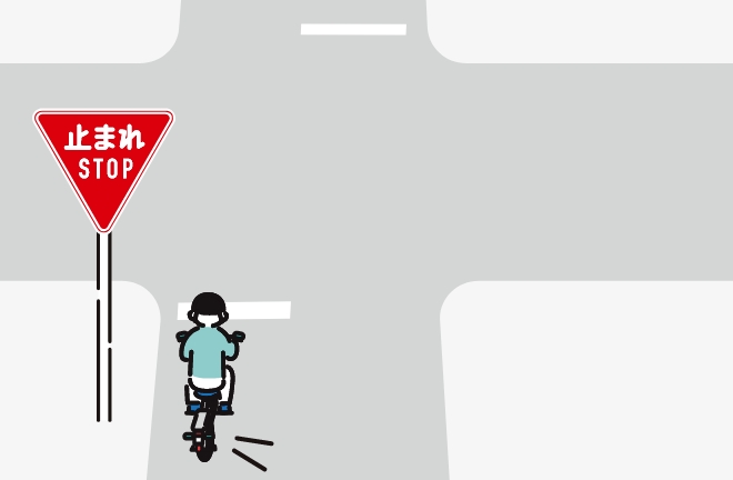 一時停止の標識があるときは、停止線の直前(停止線がないときは、交差点の直前)で必ず一時停止をするとともに、交差する道路を通行する車両等の進行を妨げてはいけません。