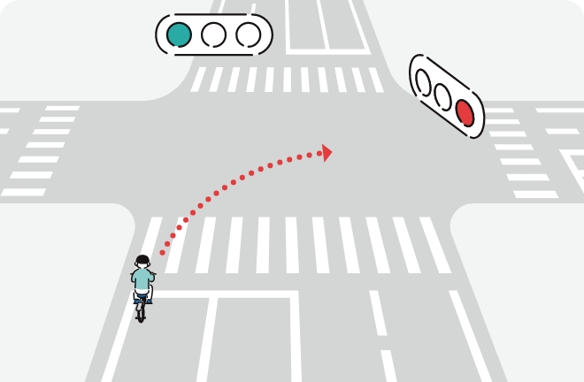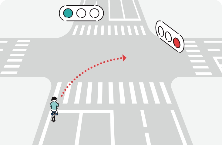 交差点手前で右側の方向指示器で合図を出し、青信号で交差点の向こう側まで直進